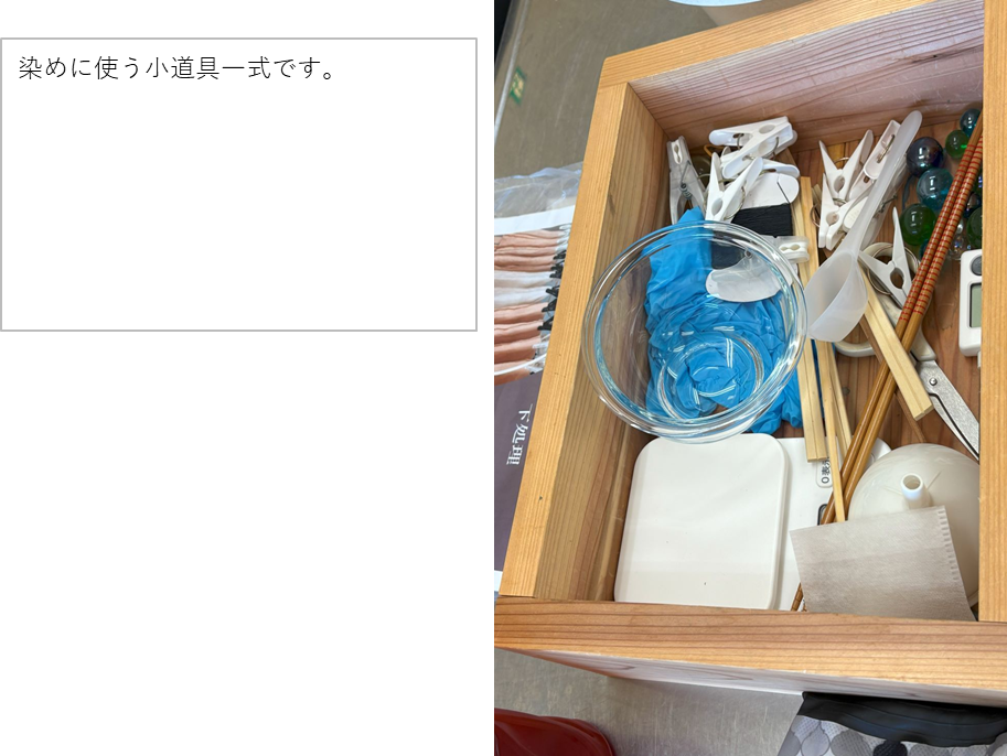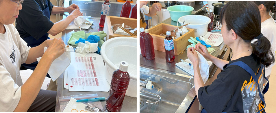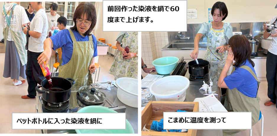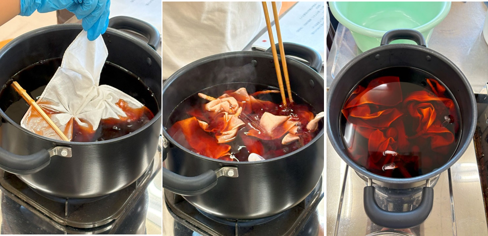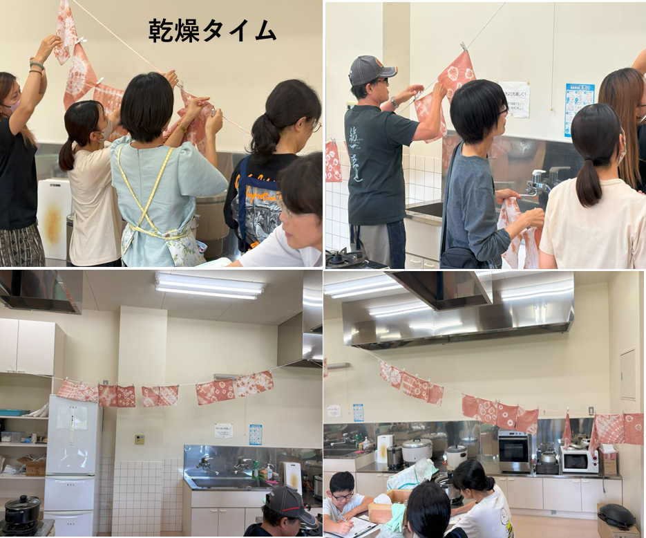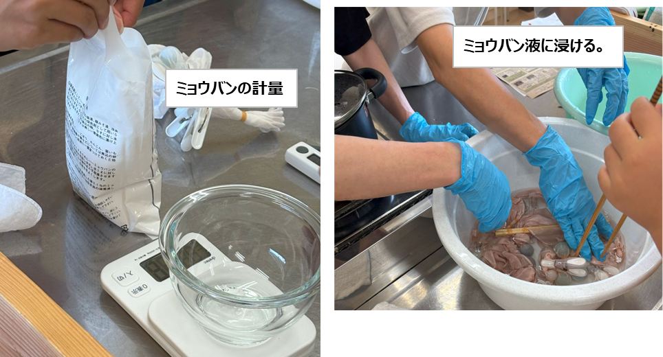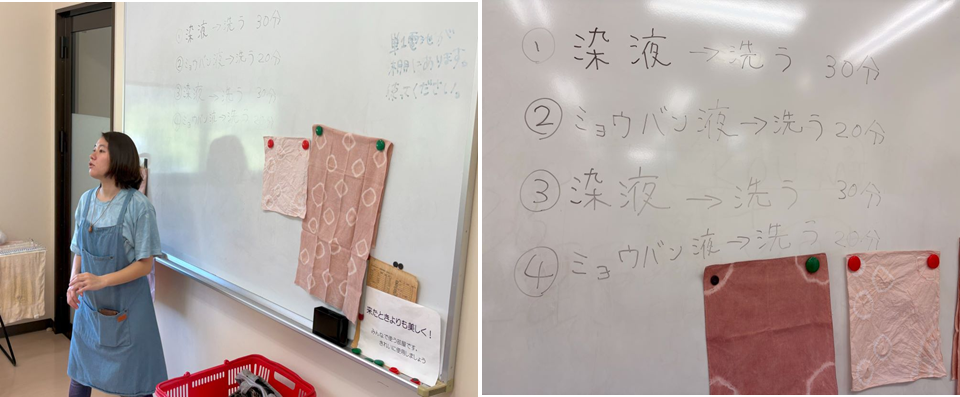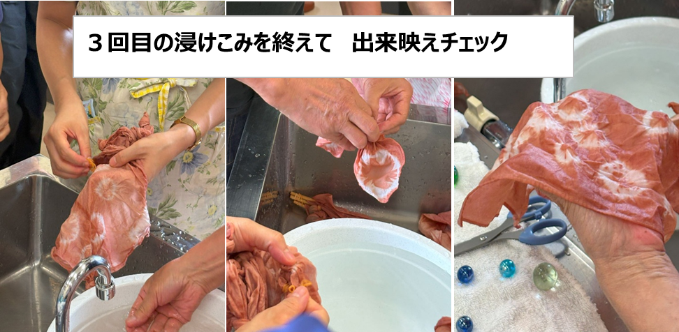 染液に浸けて、洗って、ミョウバン液に浸けて、洗ってを2回繰り返してから乾燥する手順です。