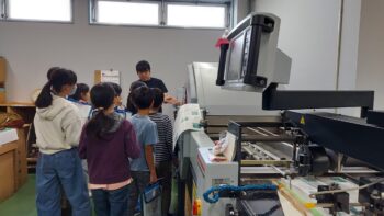 3階にはキッチンがありました。「手づくりランチをみんなで食べることもあるんですよ」と社員の方が話します。その奥にはデザイナーの方のスペースがありました。お客さんの「こんな印刷物をつくりたい」という要望を営業担当から聞き、パソコンでデザインをしています。お客さんの要望を直接聞いてくる営業社員とモニターで頻繁に打合せができるようになっていました。「すごい!」社員の労働環境を良くする工夫がされていました。また、3階には「オンデマンド印刷機」が2台ありました。デザイナーがデザインした印刷物がデータで送られ、紙に印刷されます。1階にあった印刷機は液体のインクを使っていますが、この印刷機はトナー(粉)で印刷しています。なんと!白色の印刷や透明の印刷もでき、デザインの幅が広がるそうです。 ㈱マルワの社員の熱意があふれ、わかりやすい説明からたくさんの「驚き」と「発見」の時間となりました。