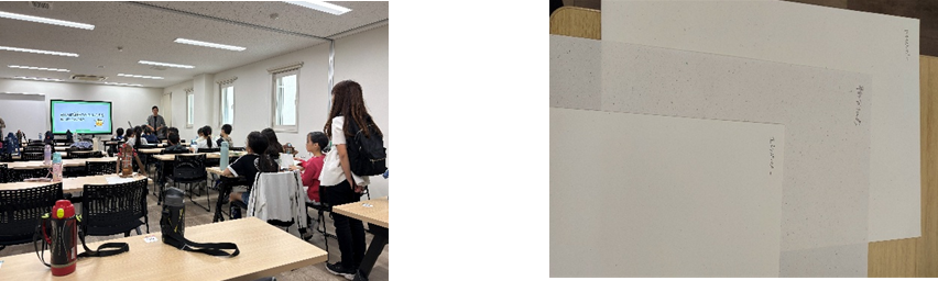 最初は、印刷会社には欠かせない「紙」の話です。専務が子どもたちに3枚の紙の説明をします。「これは、廃棄していたバナナの茎で作られた『バナナペーパー』、そして要らなくなった布の繊維を混ぜ込んだ『サーキュラーコットンペーパー』、そして広島の平和公園に飾られていた千羽鶴で作られた『平和織姫』です。触ってみてください。匂いを嗅いでもいいですよ。」子どもたちは「バナナの匂いはしない!」「この紙のブツブツはなんだろう?」「これは布?紙?」など3種類の紙の色や、触り心地、匂いをチェックし、「捨てられていたものを紙の原料に混ぜて紙にする」「紙は木材だけで作られるんじゃないんだね」と子どもたちは言葉を交わします。次に鳥原専務が「FSC認証マークを見たことがある?」と子どもたちに質問をします。「お菓子の箱にあった!」「ハンバーガーにあった!」「ティッシュの箱にあった!」などの声があがり、身近な物にFSCマークがついていることに気づきます。でも「何のマークなの?」と子どもたち。「FSC認証マークは適切に管理された森林の木材を材料に作られた製品についています。森林の違法伐採を防ぎ、生物の多様性や森林のある地域の人々の社会や生活を守るためのマークです。」と鳥原専務の説明を聞きました。