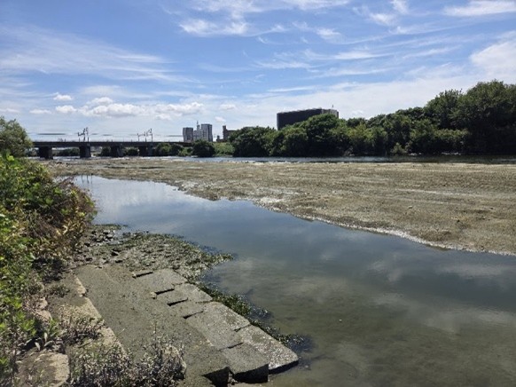最初に訪れたのは、名古屋駅近くの都心部を流れる庄内川。ここでは、名城大学附属高等学校の皆さんが2014年から続けている生物調査の現場を見学させていただきました。