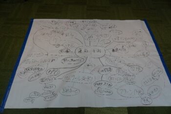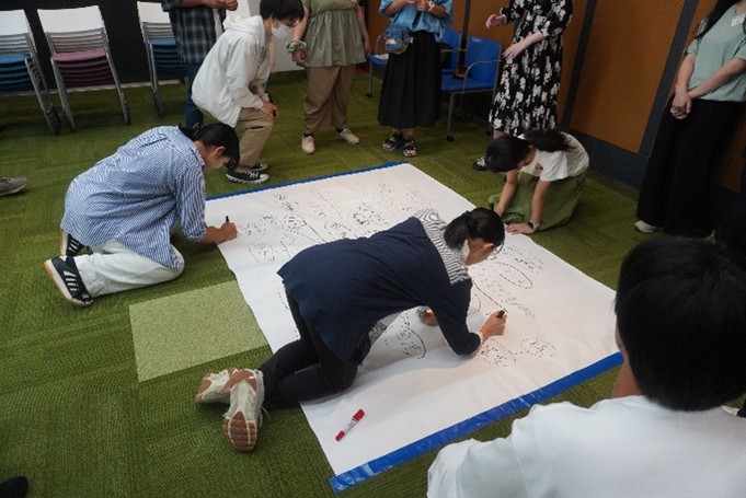 今回のワークショップは、前回のフィールドツアーで見つけた課題をさらに深掘りすることがテーマ。まずはアイスブレイクとして、参加者全員で「藤前干潟」から連想する言葉をつなげていくマインドマップ作りを行いました。一人ひとりの視点が加わることで、藤前干潟の多様な魅力や課題が浮かび上がりました。