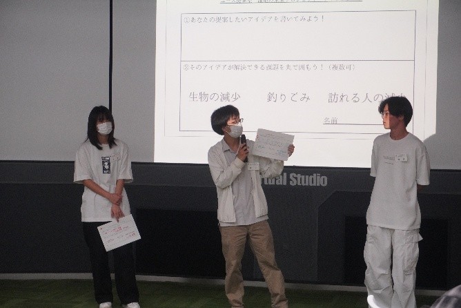 次に、いよいよプロジェクトチームの結成です。前回の活動で見えてきた3つの主要な課題「①生物の減少」「②釣りごみ」「③訪れる人の減少」について、各自が解決策のアイデアをワークシートに書き出しました。