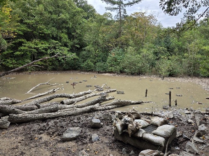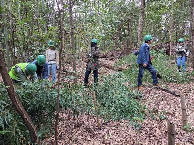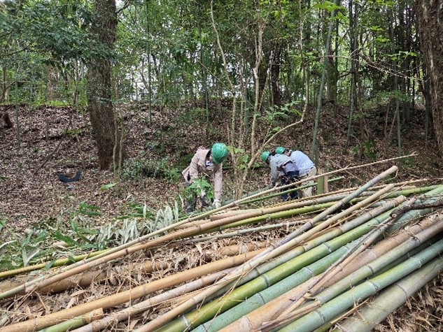 その後、林内にある「ハンノキ湿地」を見て、水位が少ないことなどの課題を自分たちの目で見ました。これらの湿地を再生するためには、まず森を適切に管理し、豊かな水が染み出す環境を取り戻すことが必要だそうです。ということで、私たちも集水域での竹の伐採を体験させてもらえました!竹1本を伐るにも本当に大変で、みんなで力を合わせて頑張りました。会のみなさんに指導してもらいましたが、手つきが慣れており、かっこよかったです。私たちの活動で、少しでも水の蒸散を防ぎ、湿地への水が保たれることを願っています。