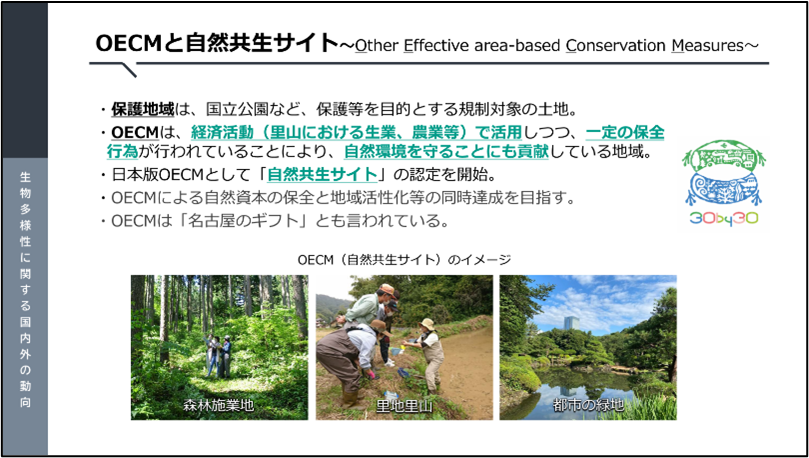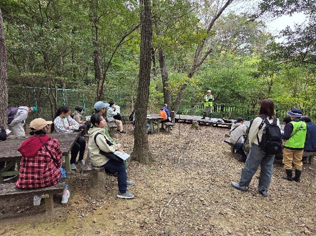 最初の目的地に向かうバスの中では、ミニレクチャータイム! 「30by30」*や「OECM(自然共生サイト)」**といった最新のキーワードや、名古屋市環境局から提供いただいた資料を基に、名古屋での生物多様性の取組みについてみんなで学びました。ちなみに、今回訪れた場所はすべて「自然共生サイト」に認定・登録されている、今まさに注目されている場所です!