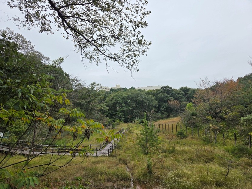 そして、いよいよ普段は入ることのでない湿地の中へ!綺麗に整備された木道の上から、シラタマホシクサやクロミノニシゴリなど、「東海丘陵要素植物」と呼ばれる、世界でもこの東海地方にしか生息していない、本当に貴重な植物たちを見せていただきました。名古屋市とは思えないその景色に感動し、あっという間に時間が過ぎてしまいました。ただ、今年は例年よりも水が少なく、植物の生育状況が芳しくないという課題も。水を確保するために、周りの樹林地で伐採を行っている現場も見学し、湿地を守り続けることの大変さと工夫を肌で感じました。