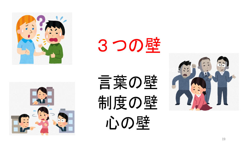 言葉の壁: 専門用語がわからない、行政に通訳がいない、自分の状況を説明できない 。