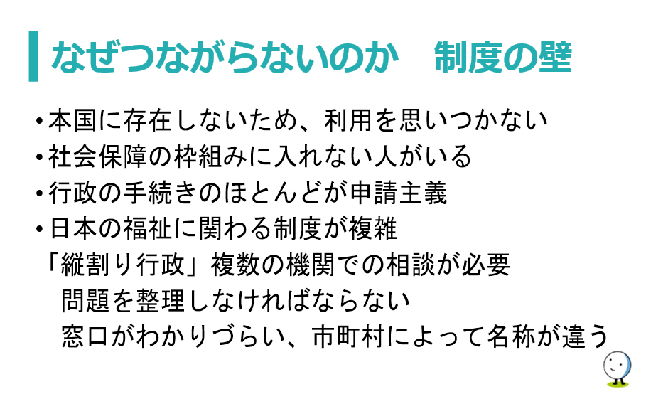 制度の壁: 日本の複雑な制度(申請主義や縦割り行政)が本国の仕組みと異なり、理解が困難 。