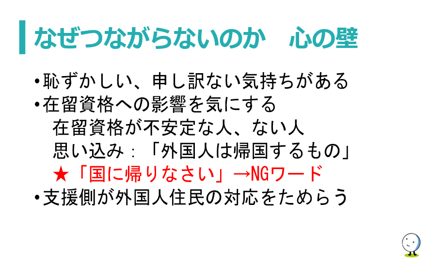 心の壁: 在留資格への影響を恐れる不安や、「恥ずかしい」という心理的抵抗、支援側の無理解 。