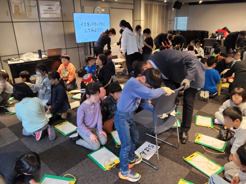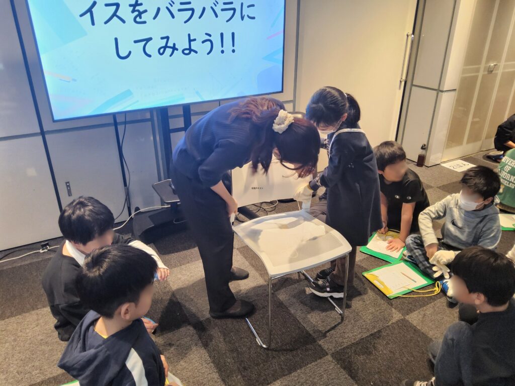 使えなくなったイスはバラバラに解体し、素材に分けてリサイクルできるようにイスが作られていました。「そうなんだ!」と子どもたち。そして、次の体験コーナーへと続きます。