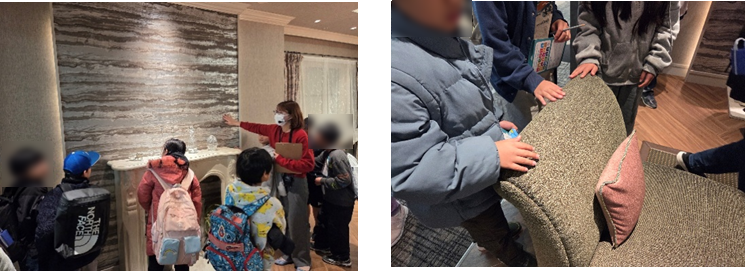 ショールームに入った瞬間、子どもたちの目が輝きました。色とりどり、いろいろな模様のカーテンや、見たこともないような壁紙。さらには、子ども部屋、寝室、ペットと暮らす部屋など様々なシチュエーションに沿った壁紙やカーテンで彩られたショールームを見学し、「こんな部屋がいい」「私この部屋好き!」と様々な感想が子どもたちから上がりました。「今日はSDGsを学びに来たんだよ!」というスタッフの声掛けに、この壁紙やカーテンがどのようにSDGsにつながっているのかな、と子どもたちは興味津々でした。実際に触ってみて、ザラザラしていたり、フワフワしていたり。子どもたちは自分の指先で、本物の素材の魅力を感じ取っていました。