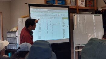 案内から戻り、ボランティアハウスで調査データから読み取れることを柳沢先生からお話ししていただきました。現在の林の状態は日光の取り合いの結果であることが良く分かりました。木はそれぞれ成長速度が異なり、また、成長に必要な日光照度が異なります。明るい林はアベマキ林で落葉樹が多く、低い木や草本も見られ、多様性が高い林である事が分かりました。暗い林は落葉高木樹であるコナラと常緑樹であるアラカシ林で、地表近くには幼木や草本が少ない多様性が低い林である事が分かりました。