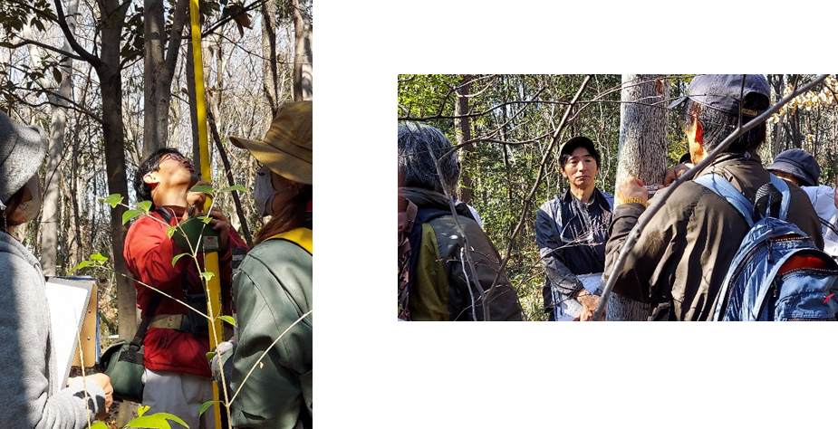 続いて、あらかじめ緑地内に設定した調査範囲での実習です。駆け足でしたが、5m✕10m、5m✕5mの2つの方形区を調査しました。柳沢先生からは優占種の見方、胸高直径の測り方、樹種名などを教えていただきました。優占種とは、その林の中で最も多い種のことです。優占の基準は胸高断面積や、幹の本数など様々です。林分の名前は上空から調査範囲を見た時に一番樹冠の面積の多い樹木でつけます。樹高が高く、枝を広げている木の名前がつくのが普通です。林分の名前は林冠の優占種の種名をとり、コナラ林、クスノキ林などと呼びます。
