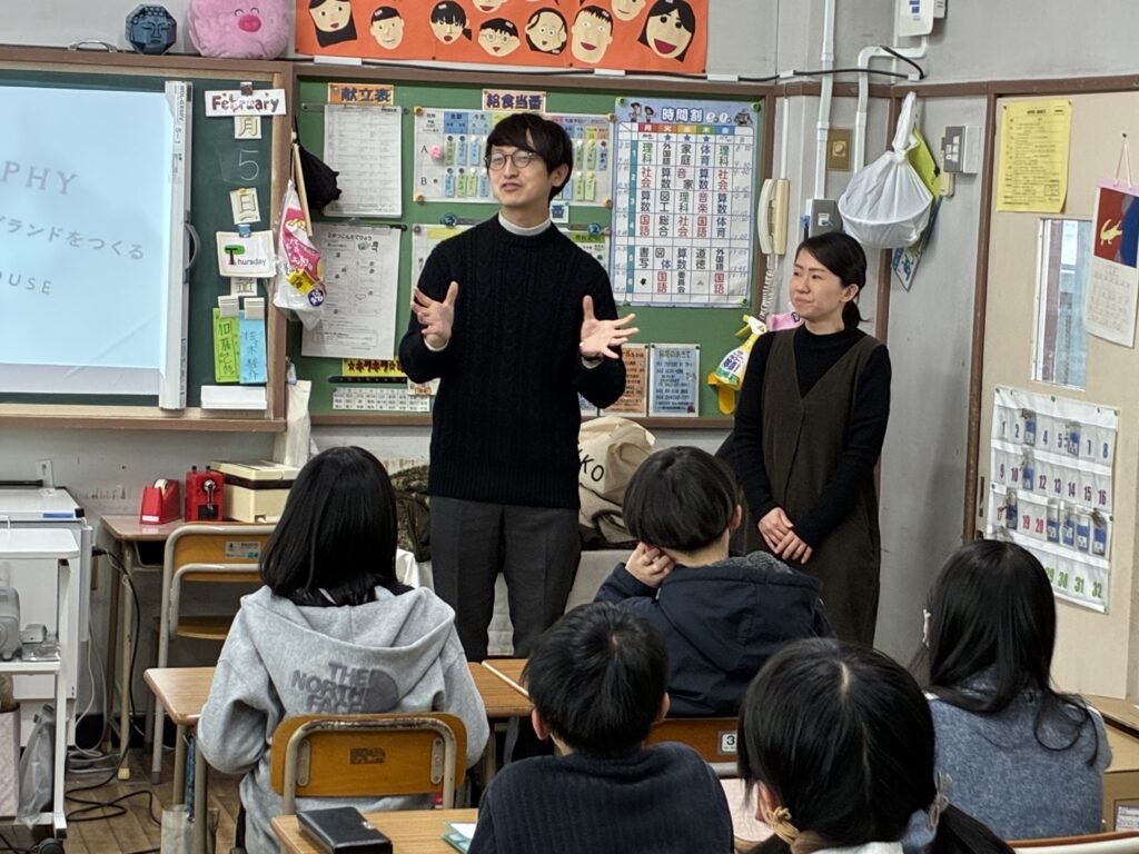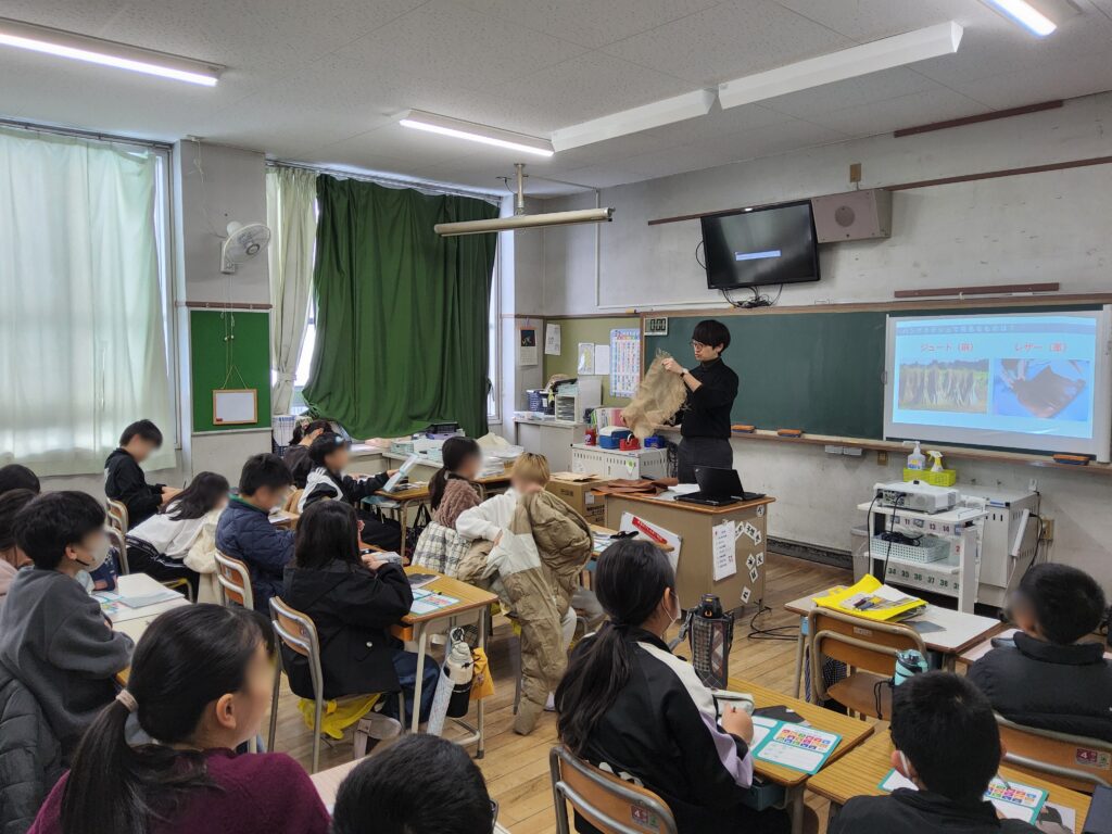 今回の「なごやSDGsスタディツアー」は、マザーハウスの社員を招いての学校での授業とマザーハウス名古屋星が丘テラス店訪問をコンテンツとしました。5日(木)に5年1組、6日(金)に5年2組・3組と2日間かけて、【学校での授業→店舗訪問】グループと、【店舗訪問→学校での授業】グループと2つに分けて行いました。した。【店舗訪問→学校での授業】グループの学習の様子をお伝えします。