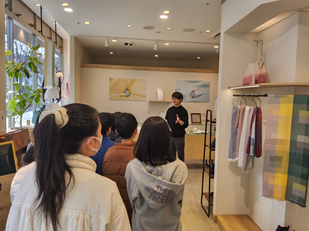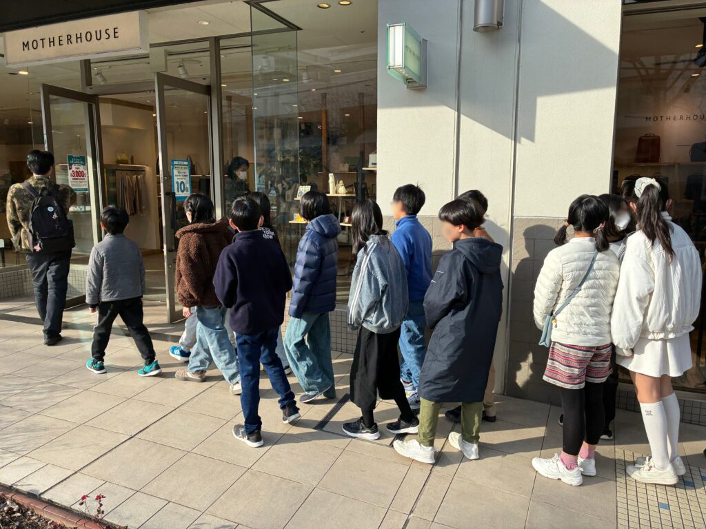 学校から歩いて10分ほどにあるある星が丘テラスに、マザーハウスの店舗はあります。「あっ!ここ知ってる、前を通ったことがある」「初めて入った!」「かわいい、このお財布!」と、子どもたちの声がはずみます。星が丘テラス店の大岩店長が出迎えてくださり、店内を案内してくださいました。
