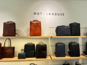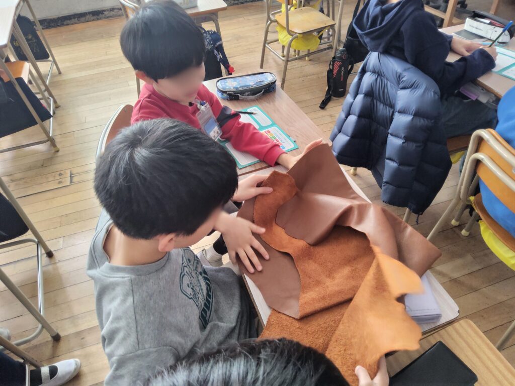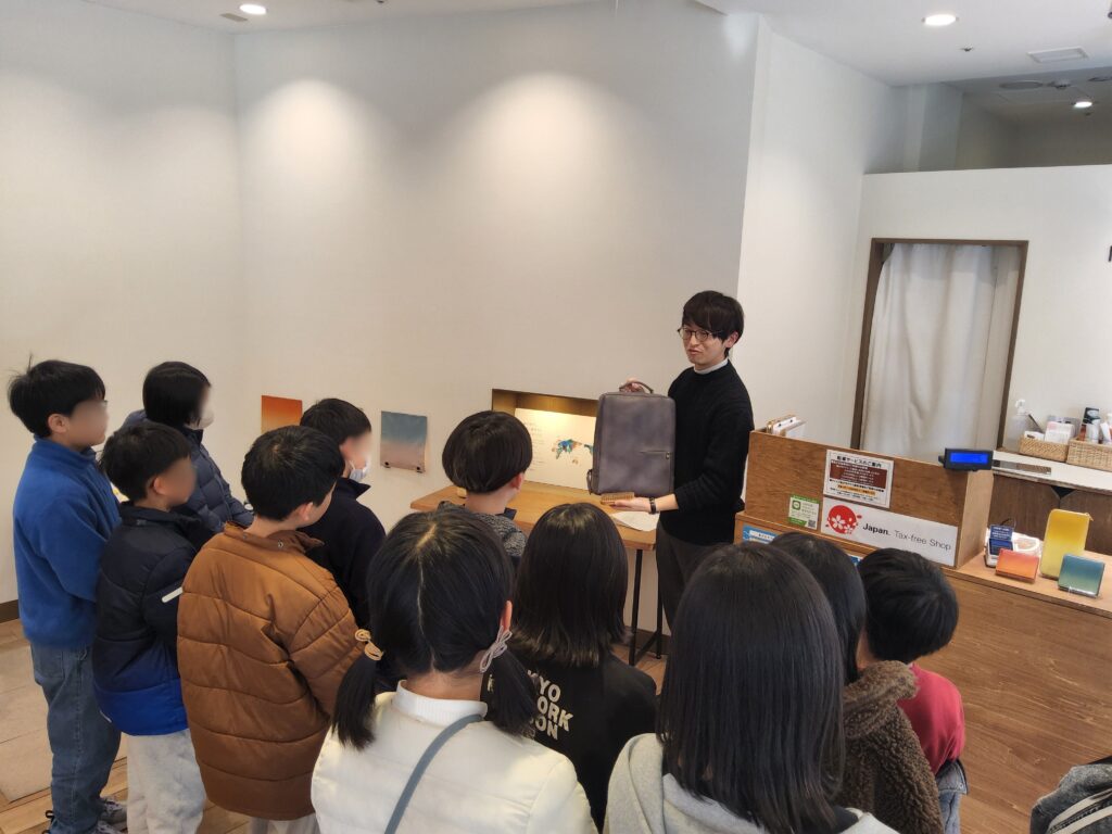 店舗スタッフが革のバックのお手入れ方法として、ケア用品を使ってのブラッシングを教えてくれました。「こうやってケアをして大切に長く使ってほしいんです。」リンネシリーズの説明も聞きました。「輪廻は生まれ変わるという意味です。回収したバッグを解体して、使える革を使って作られた、生まれ変わった商品です。一つひとつ革の質感や色が違っていて世界に一つだけのもバッグです。」、子どもたちは「すごい!」「一つしかないんだ」と驚いた様子でした。