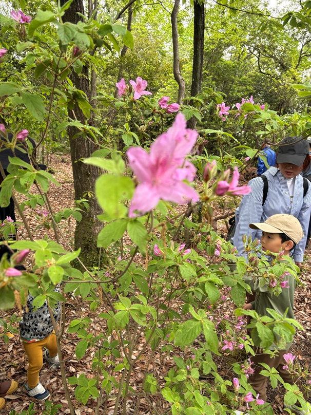 まずは、春へと向かう森の散策からスタートです。歩き始めてすぐに、鮮やかなピンク色の「モチツツジ」が私たちを迎えてくれました。