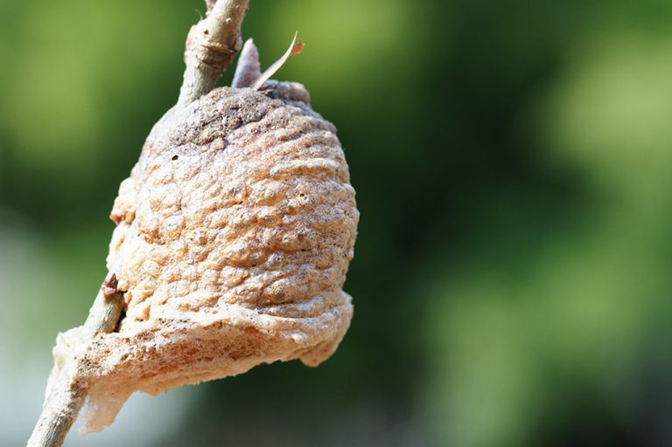 散策の途中、枝に付いた「ハラビロカマキリの卵」も見つけました! (※写真はうまく撮れなかったので他からの流用です。)